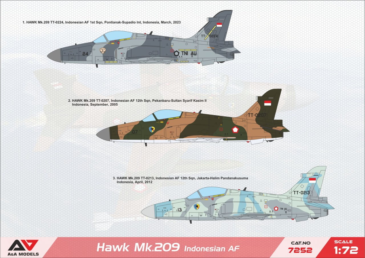 A&A Models 7252 is a plastic model kit representing the BAE Systems Hawk 209 light attack aircraft operated by the Indonesian Air Force. Produced in 1/72 scale, the kit allows the modeller to recreate one of the export combat variants of the well-known British Hawk family.