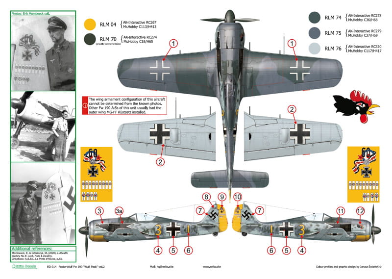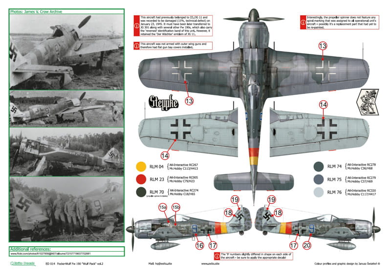 The markings for one of the very few known Fw 190 A-5s with the famous JG 2 eagle design and a rare Fw 190 A-8 carrying the name ‘Steppke’, JG 11 emblem and JG 301 identification band, have never been reproduced in decal form before, whilst the Fw 190 D-9 with the sparcely seen bright blue band of JG 54 was recently incorrectly identified and depicted by one of the kit manufacturers. Our instruction sheets include several photos of all depicted aircraft, some of which you may have never seen before. Illustrations were created by Janusz Swiatlon.