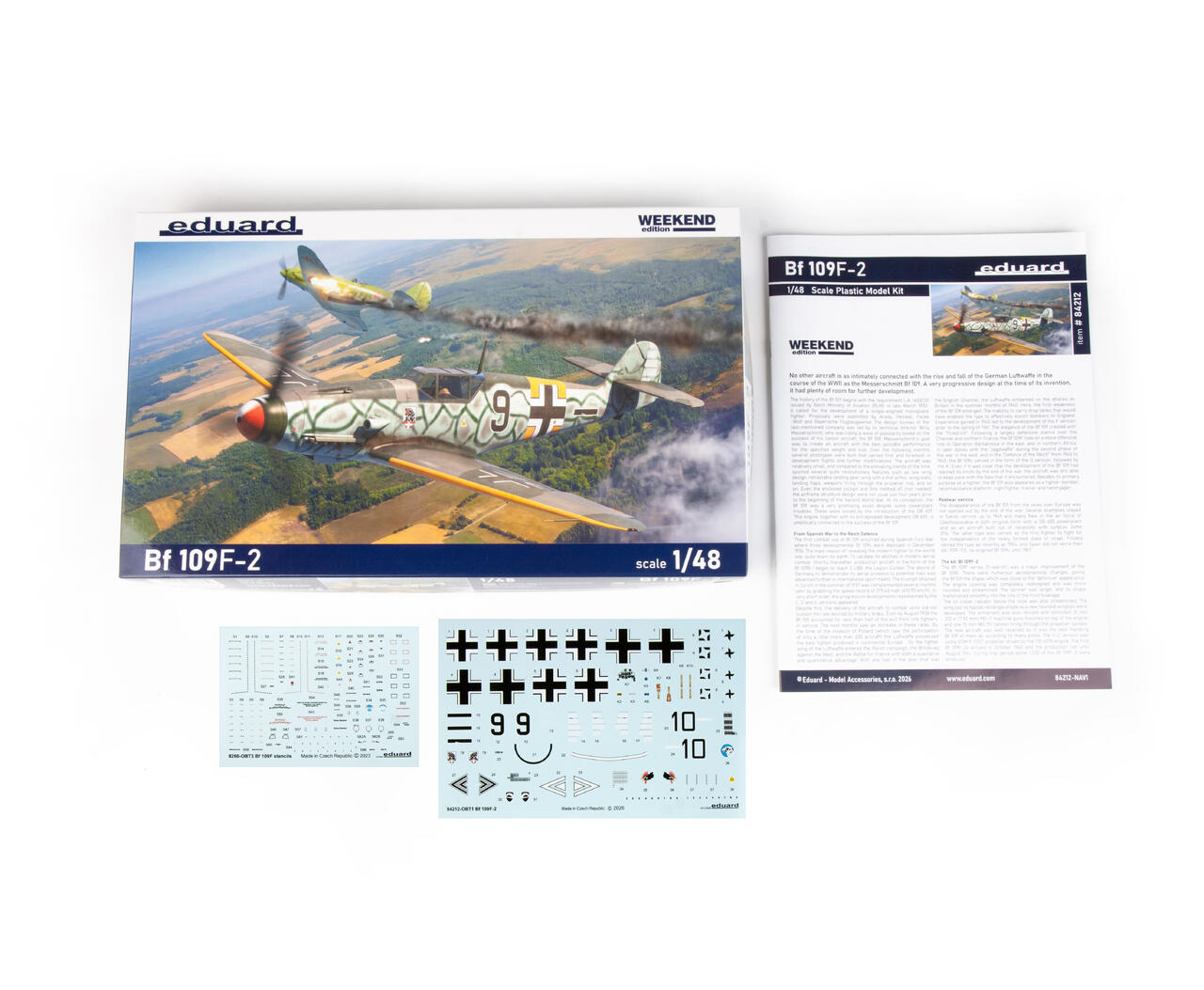 The Eduard 84212 kit features the Messerschmitt Bf 109F-2 in 1:48 scale as part of the Weekend Edition series. This version offers a simplified package without photo-etched parts or masks, allowing for a quicker and more straightforward build while maintaining the high level of detail typical of Eduard kits.