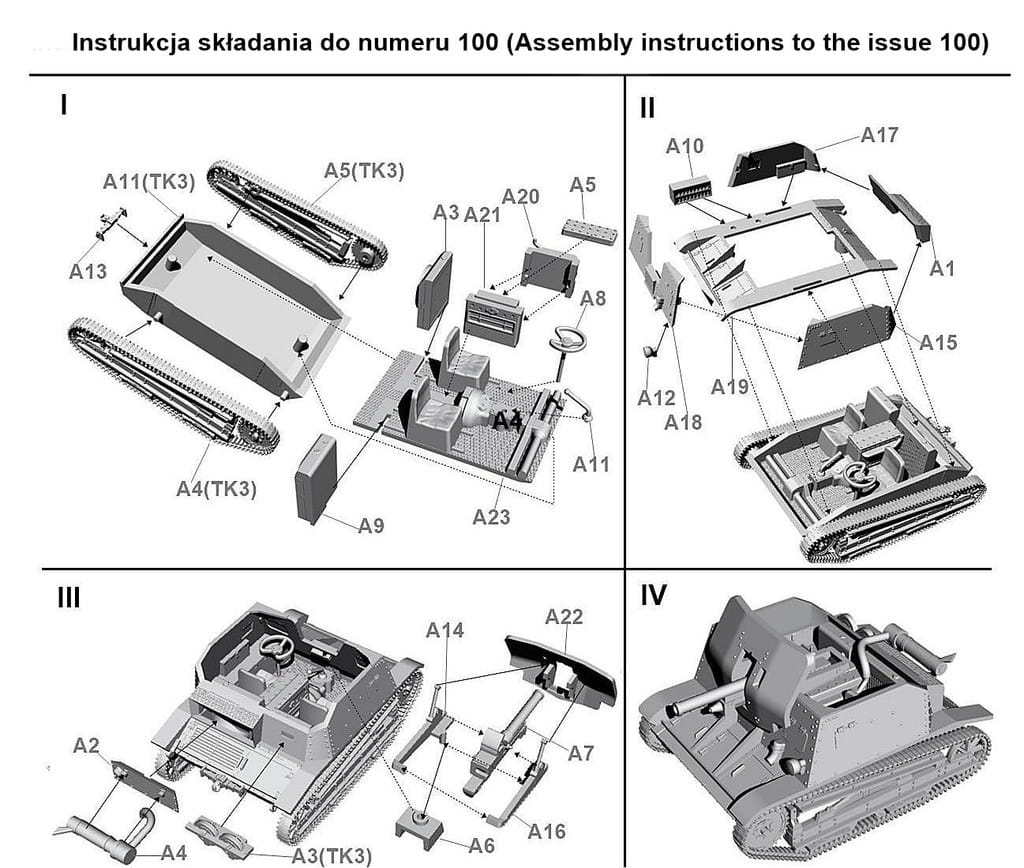 Unassembled plastic model kit of a Polish self propelled gun TKD. Set includes historical magazine with various informations about the featured model kit.