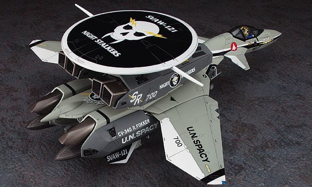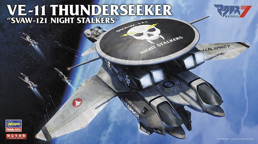 Hasegawa 65822 in 1:72 scale represents the VE-11 Thunderseeker, a reconnaissance and electronic warfare variant derived from the VF-11 Thunderbolt. The kit features the markings of SVAW-121 “Night Stalkers” squadron from the Macross 7 universe.