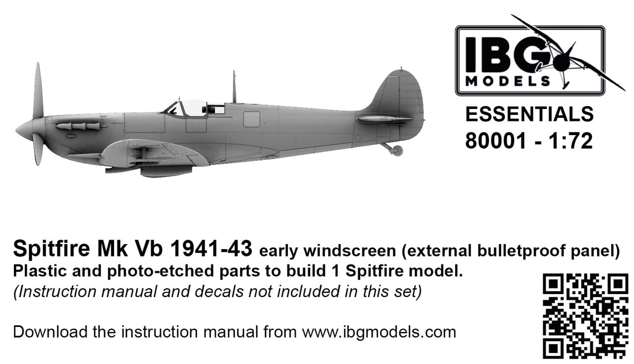 The IBG 80001 kit represents the famous British Supermarine Spitfire Mk Vb fighter aircraft in an early configuration used between 1941 and 1943. This version features the early cockpit windscreen with an external bulletproof panel mounted in front of the canopy.
