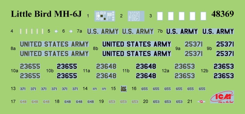 ICM 48369 features the MH-6J Little Bird in 1:48 scale. This compact helicopter is derived from the OH-6 Cayuse family and was adapted for special operations missions. The MH-6J is operated by U.S. Special Forces for rapid insertion, extraction, reconnaissance, and support missions in urban and difficult terrain.