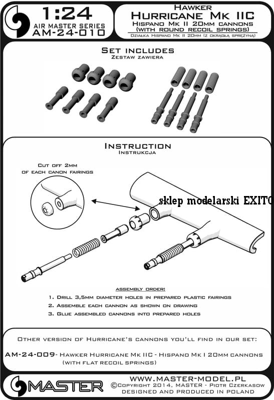 Set includes very detailed and accurate parts machined from metal like gun barrels, Pitot tubes etc. Depending on the machine the set is recommended also included can be intricate resin parts or additional photoetched details. Aside from few sets designed to fit model kits from a specified brand most of the Master products are universal sets - they will fit any model kit of a given machine in a particular scale. Assembly of the set is clearly depicted in the included instructions, usually requires some ingerention in the model kit as e.g drilling out the holes in a proper diameter for the metal elements and gluing them in using a CA glue.Details made from brass can be, instead of painting, naturally blackened using Master Blackening Agent to create a natural layer of black oxide looking just like the real blackened gunmetal.