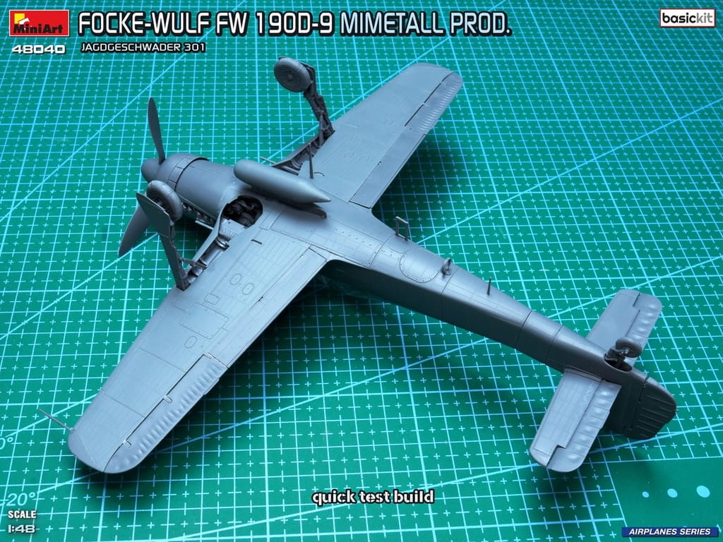 The MiniArt 48040 kit features a detailed model of the Focke-Wulf Fw 190D-9, a high-performance German fighter developed to improve high-altitude capability. Aircraft produced by Mimetall in the late stages of World War II often displayed simplified finishes and variations in appearance. Aircraft from Jagdgeschwader 301 were among those flown during the final phase of the conflict.