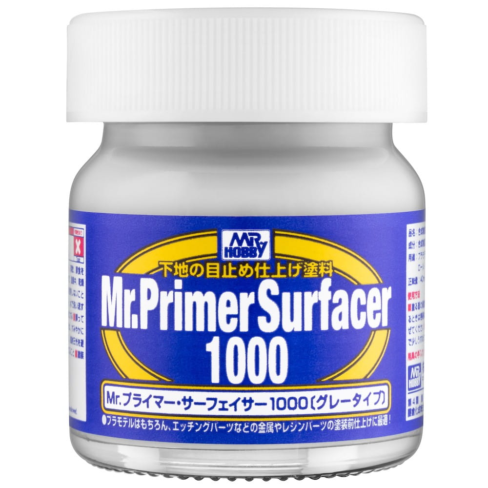 They are primers with microfiller and are based on organic solvents, which gives them extraordinary adhesion and mechanical resistance while being easy to work later on. They come as liquid in 40ml jars or a ready to use 170ml spray can. Apply liquid Surfacers only using an airbrush after thinning with a proper thinner (Mr.Color or Leveling thinner) in a ratio at least 1 part Surfacer to 3 parts of thinner.