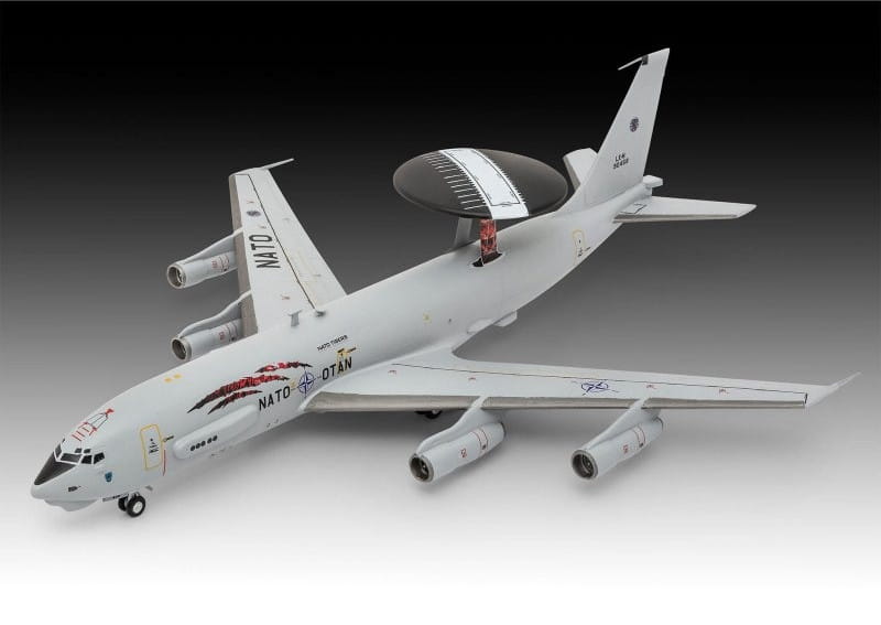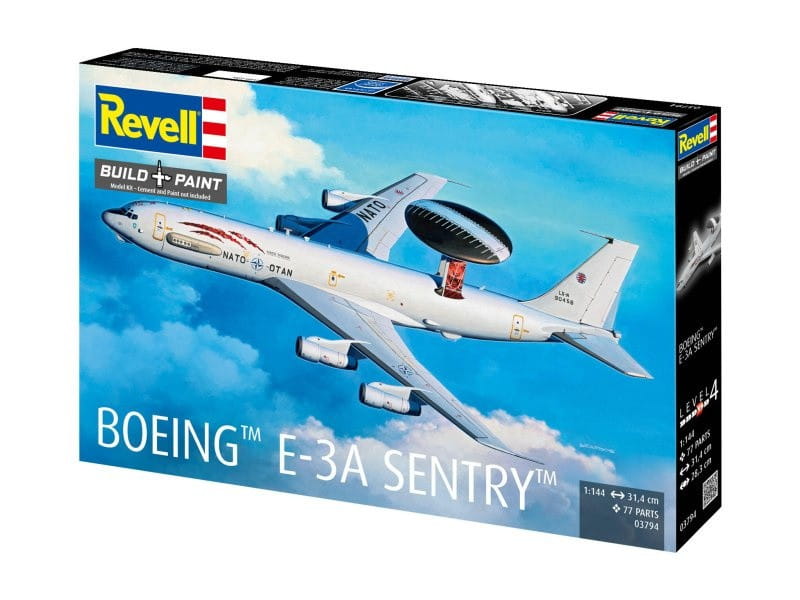Revell 03794 przedstawia model samolotu Boeing E-3A Sentry w skali 1:144 – jednego z najbardziej znanych samolotów systemu wczesnego ostrzegania i dowodzenia AWACS (Airborne Warning and Control System). Maszyna ta stanowi kluczowy element nowoczesnych systemów obrony powietrznej i kontroli przestrzeni powietrznej.