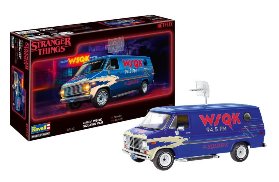 The Revell 07732 kit represents the GMC WSQK “Squawk Van”, the distinctive vehicle featured in the Stranger Things TV series. In the show, the van serves as a mobile radio station and has become a recognizable element of the series’ 1980s atmosphere.
