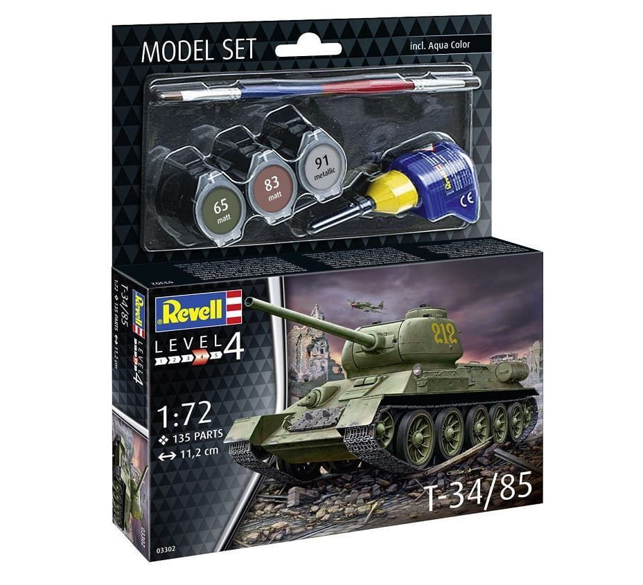 Unassembled plastic model kits of the Soviet T-34/85 medium tank.