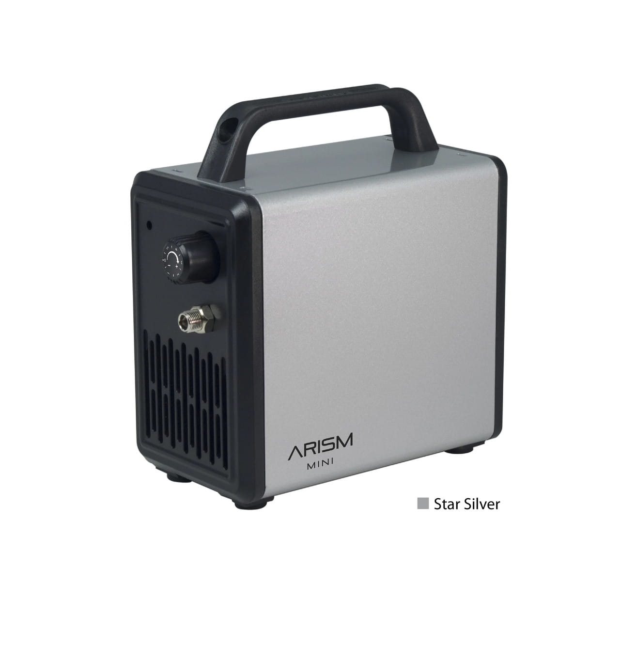 ARISM Mini is a desktop compressor of small size - an even smaller version of the well-known ARISM series. Despite its small size, it offers a maximum pressure of up to 3 bar and provides a stable source of air for your airbrush. Very quiet - so it can be used in an apartment. The very compact design saves space, and the airbrush hanger integrated with the carrying handle provides a tidy workspace and a safe place to put the tool away. Equipped with a pressure regulator, with which we can smoothly set the desired value. The regulator has a scale that serves as a reference point for our settings. The compressor works continuously - we recommend about 10-15 minute breaks to cool down the device, after every 30 minutes of work. The compressor has protection against overheating. Air outlet - standard 1/8" thread. The kit includes a 2m hose to connect to the airbrush. Silver color of the housing.