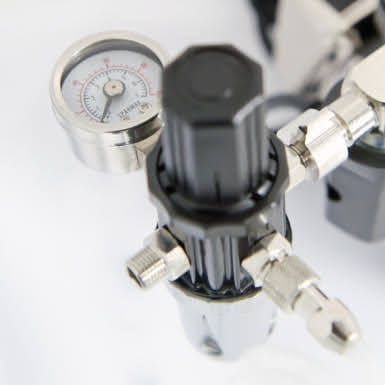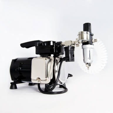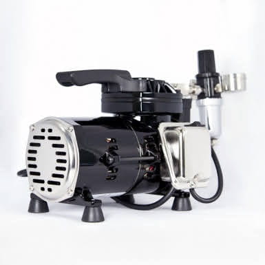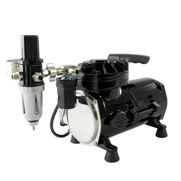 Piston oil-free compressor from Sparmax model TC501N for powering airbrushes. Its small size and quiet operation make it ideal for use in apartments and small workshops. Equipped with a dehydrator with pressure regulator and auto start/stop system. The kit also includes a 2m braided hose for the airbrush.