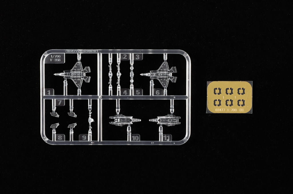 Trumpeter 03477 includes 12 F-35B Lightning II aircraft in 1:700 scale. The “B” variant is designed for STOVL (Short Take-Off and Vertical Landing) operations, allowing it to operate from smaller aircraft carriers and amphibious assault ships. These miniatures are ideal for detailing modern naval vessels in the same scale.
